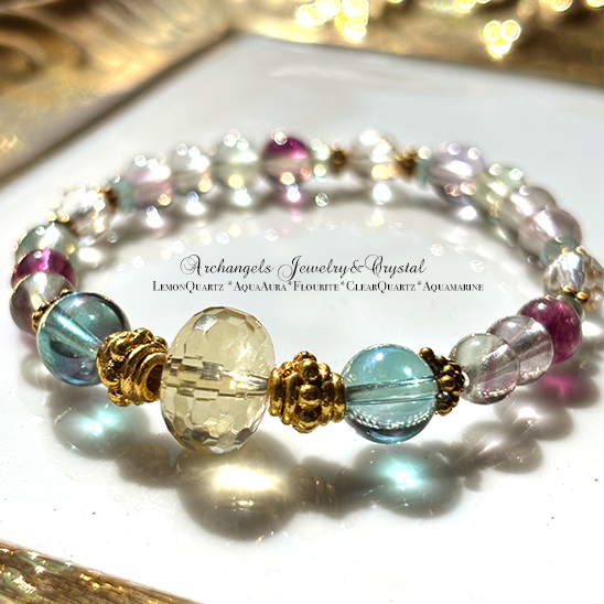 Amuletブレス 「HIKARI」レモンクォーツ*アクアオーラ*フローライト*アクアマリン*クリアクォーツ
